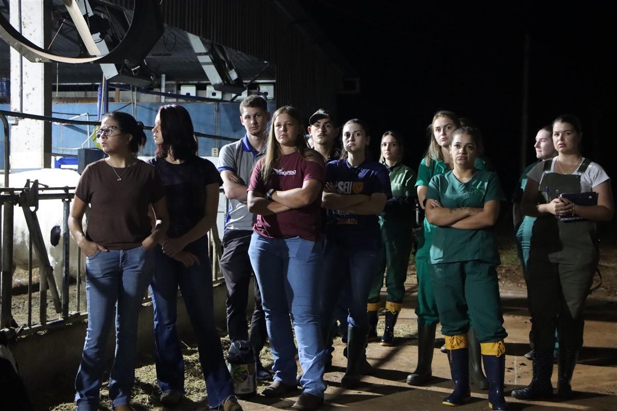 Durante a noite, os estudantes foram acompanhados pelas irmãs Cristina Rickli (Agrônoma) e Esther Rickli (Médica Veterinária) e conheceram as instalações da propriedade, os animais, o manejo, a leiteria, as formas de cuidados, as dietas e outros pontos importantes.