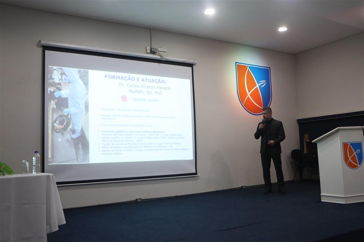 A Semana Científica e Encontro de Iniciação Científica da UniGuairacá Centro Universitário continua movimentando a instituição. Na noite de terça-feira (11), os acadêmicos participaram das palestras intituladas “Propriedade intelectual na pesquisa universitária”, com a Profª Dra. Cláudia Crisostimo e “O papel da pesquisa científica nos ecossistemas de inovação”, com o Profº Ms. Agenor Felipe Krysa. Já nesta quarta-feira (12), o Profº Dr. Carlos Ricardo Maneck Malfatti trouxe aos participantes a temática “Perícia Criminal Científica”.