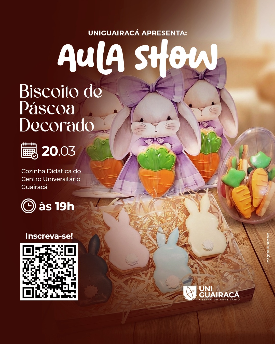 Estão abertas as inscrições para a Aula Show de Biscoito de Páscoa Decorado da UniGuairacá Centro Universitário, uma oportunidade especial para quem deseja aprender novas técnicas de confeitaria e se preparar para uma das datas mais doces do ano. A atividade vai ensinar o passo a passo da produção e decoração de biscoitos temáticos, com formatos e acabamentos criativos inspirados na Páscoa.