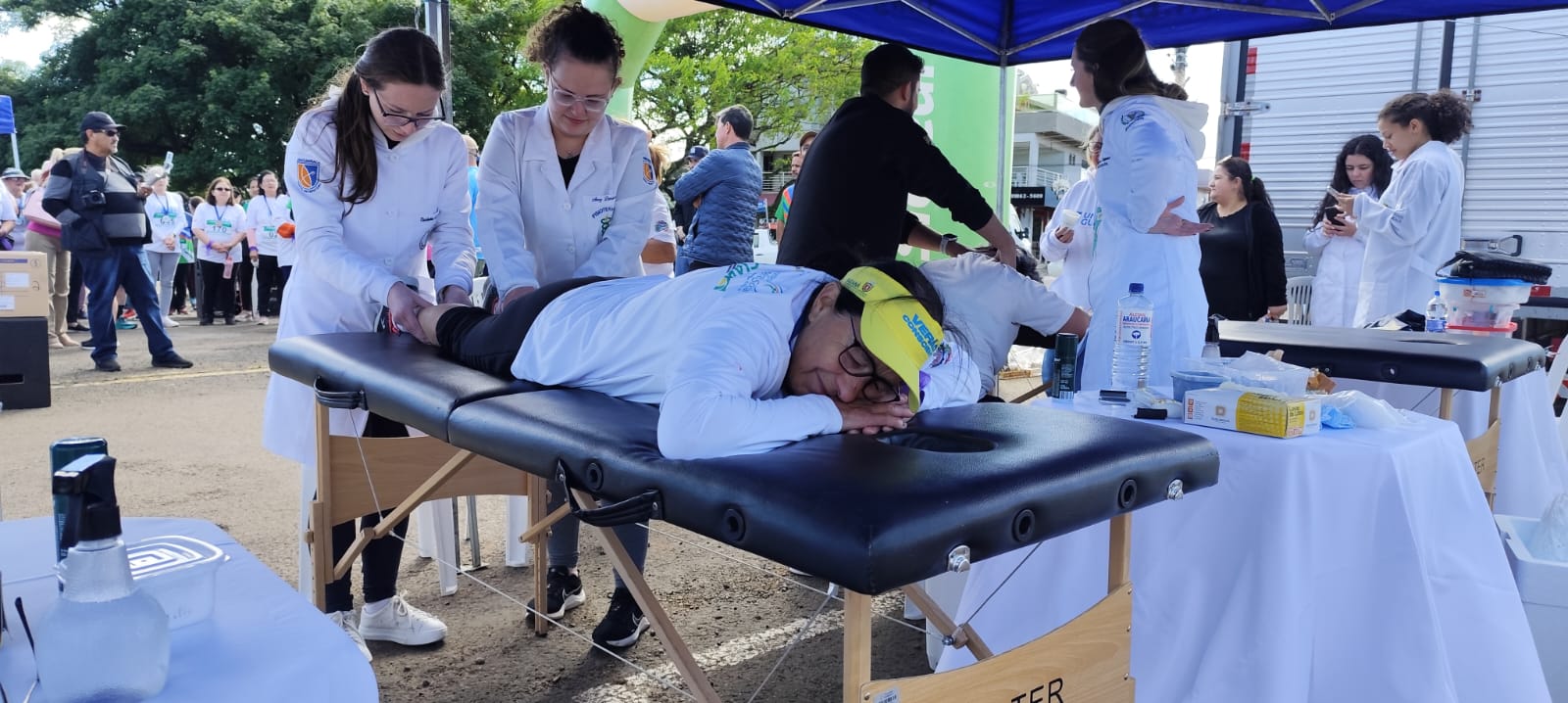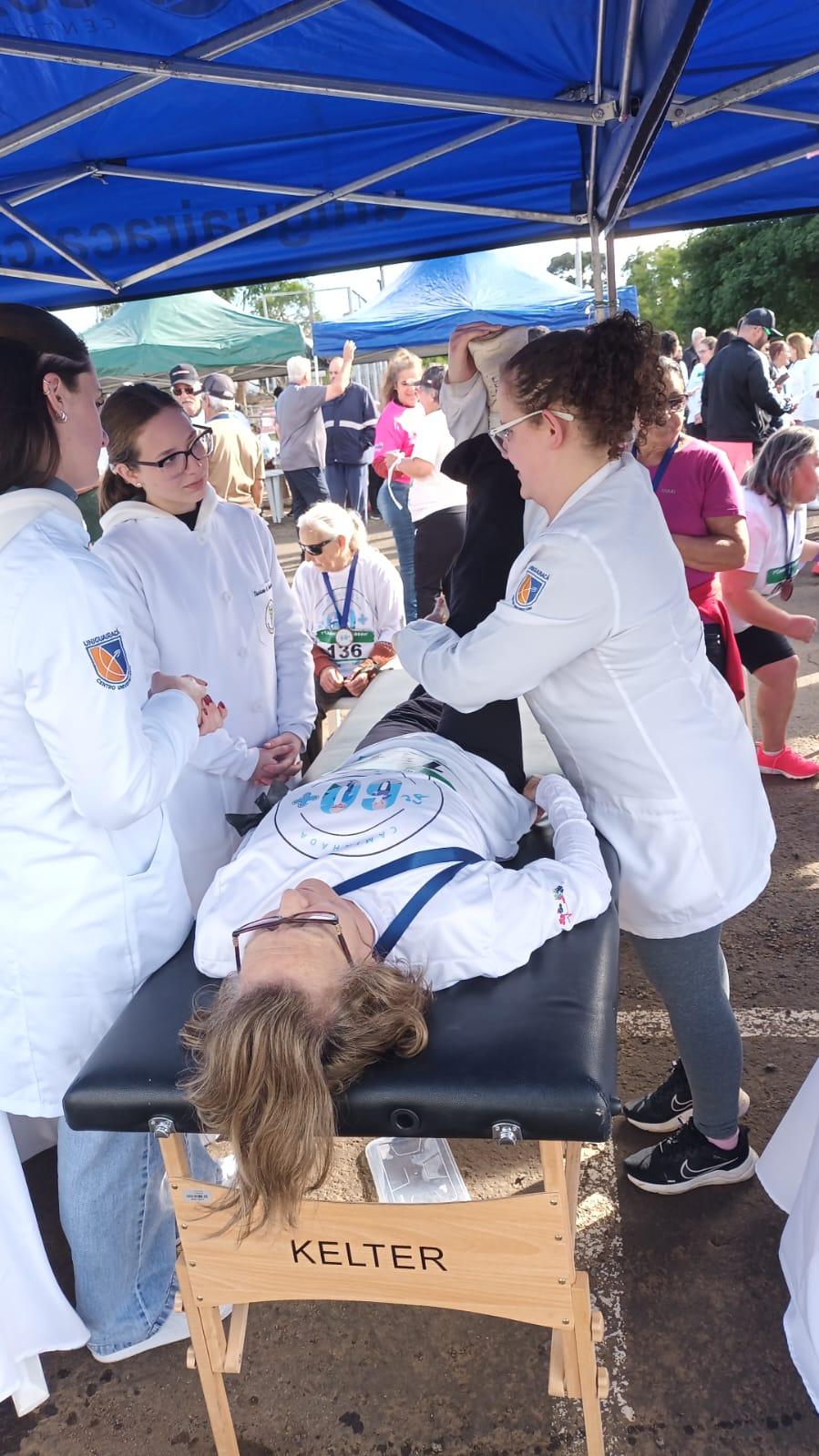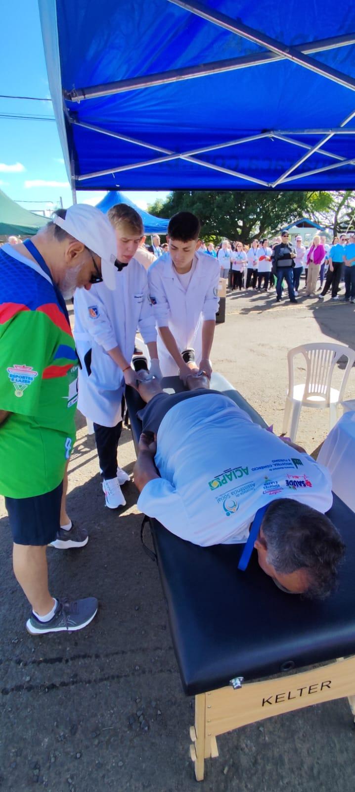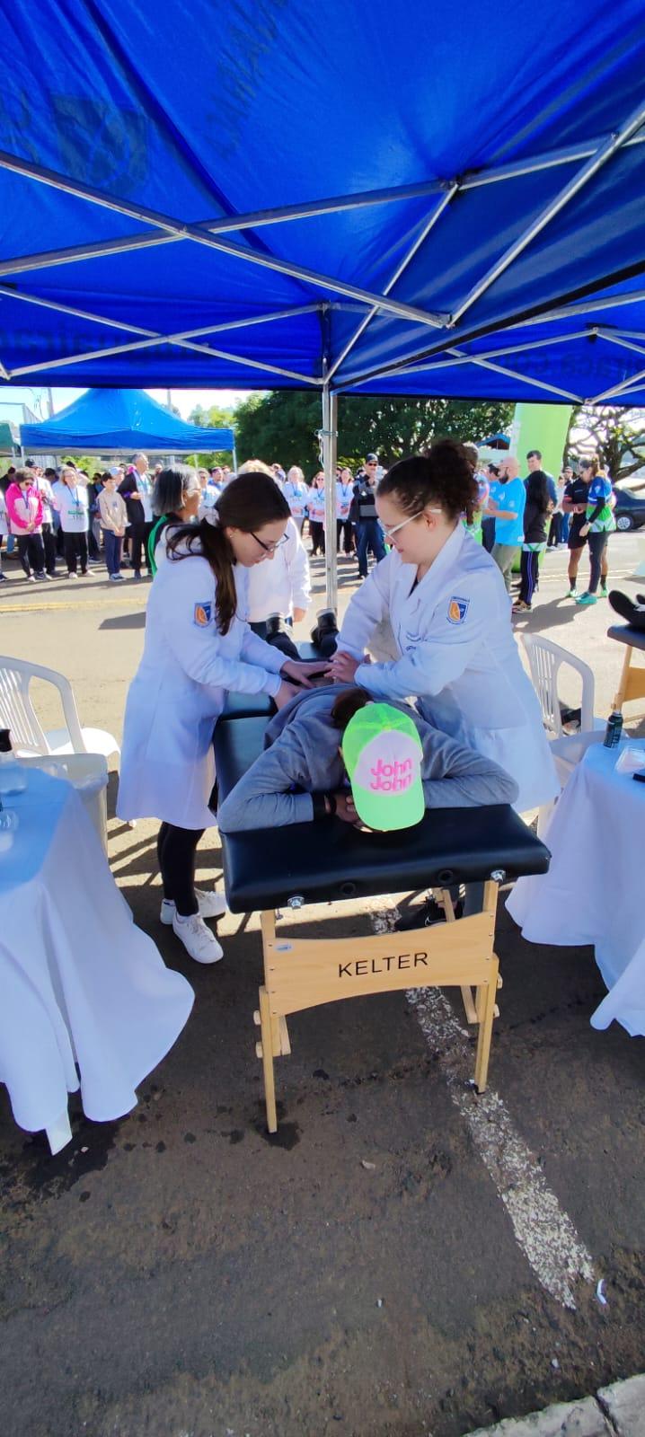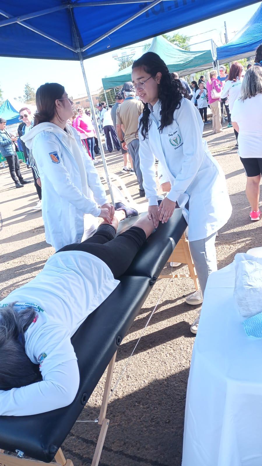 Os alunos auxiliaram os participantes com massagens e exercícios, colocando em prática os conhecimentos adquiridos em sala de aula em prol da comunidade.