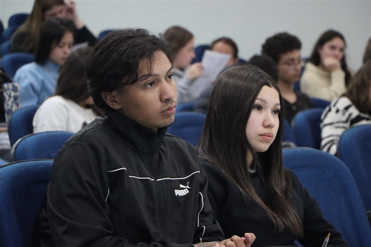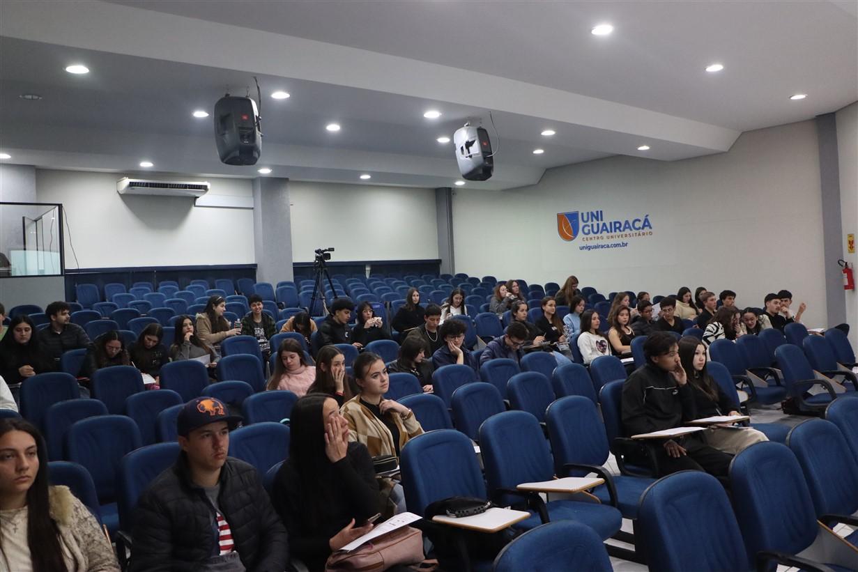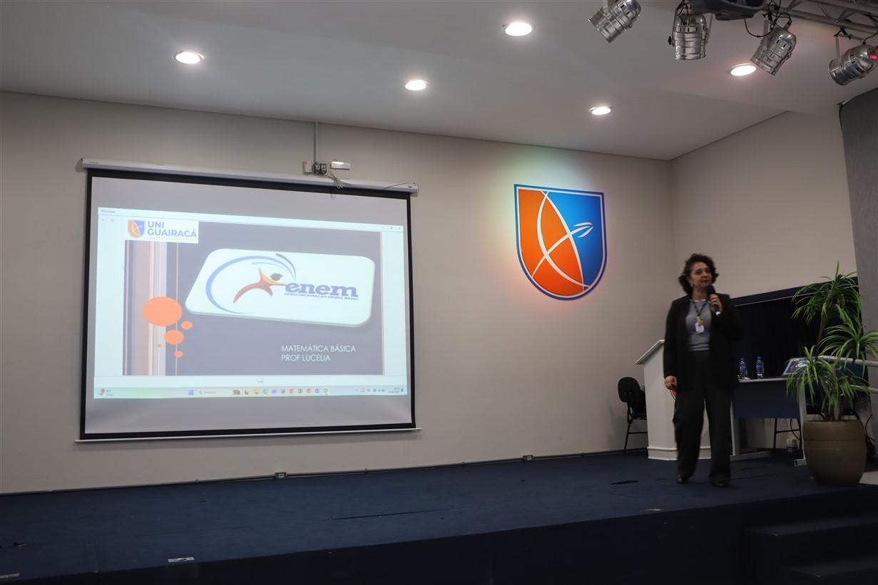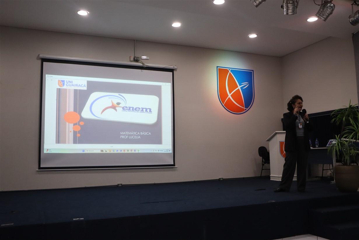 Na noite desta quarta-feira (22), a UniGuairacá Centro Universitário realizou o 1º Aulão Intensivo para o Exame Nacional do Ensino Médio (ENEM). No evento, os participantes revisaram Matemática Básica com a Profª Lucélia Ferreira de Paula, do Colégio Guairacá, e Redação com a Profª Dra. Nincia Teixeira, do Departamento de Letras da Universidade Estadual do Centro-Oeste (Unicentro).