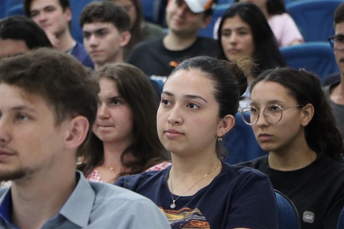 Na noite desta quarta-feira (4), os acadêmicos do curso de Medicina Veterinária participaram da Aula Magna Comunicação Profissional e Oratória Moderna, com Guilherme Nunes. O foco do evento foi o desenvolvimento de competências comunicacionais aplicadas ao contexto acadêmico e profissional. “Durante a trajetória profissional, os alunos vão perceber que a comunicação e o oratória estão no nosso dia a dia. E não é só na nossa convivência com quem está perto, mas também na vida profissional. Desde uma entrevista de estágio a uma futura entrevista de emprego, e até mesmo as apresentações de trabalho em sala de aula. Muitos me questionam como eu me posiciono, como eu falo, qual a posição que é melhor para ficar e meu tom de voz. Então hoje o Guilherme veio falar sobre isso”, ressalta a coordenadora do curso, Profª Eloara Giovanna.