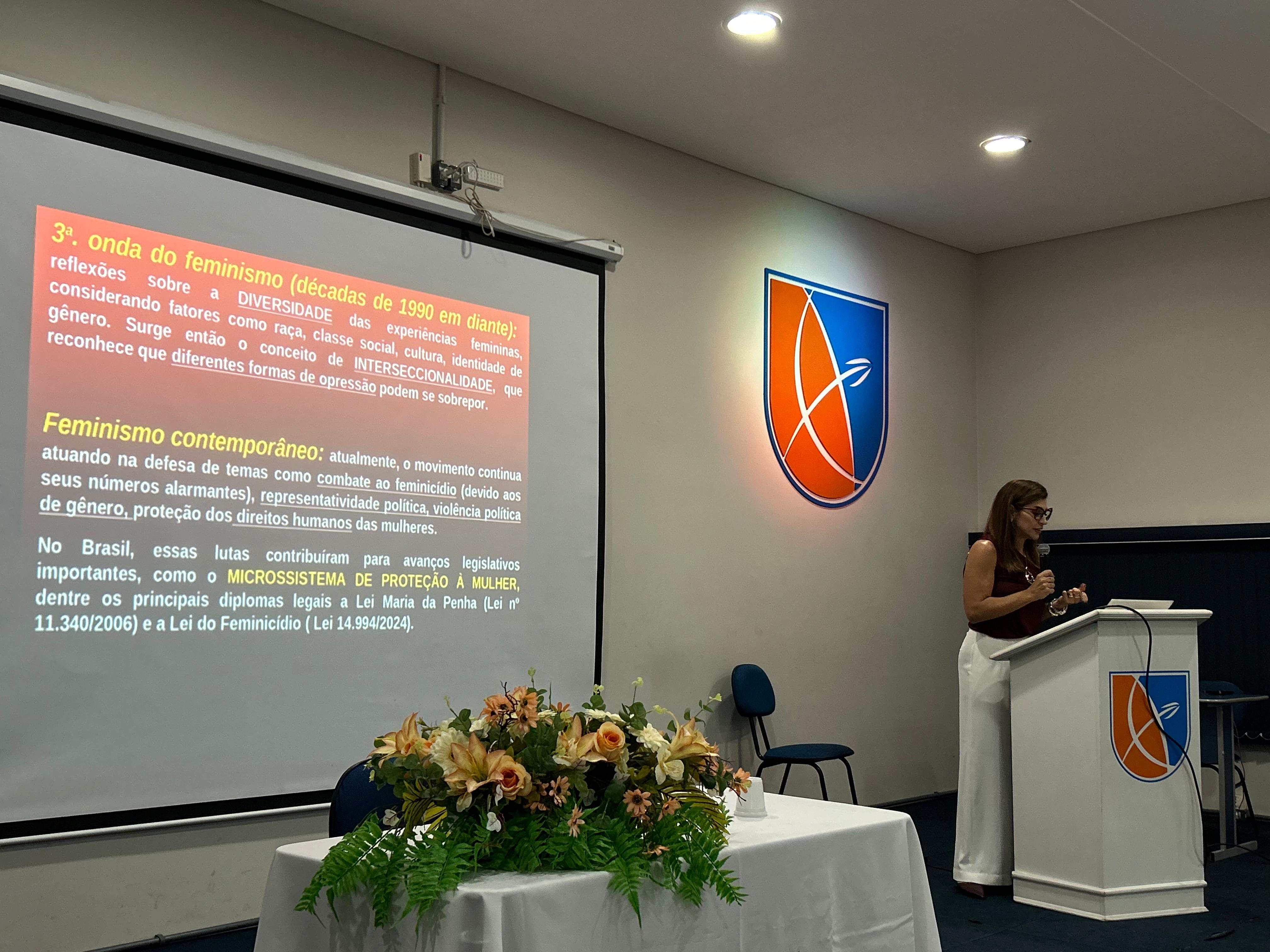 Durante a fala, Dúnia trouxe toda a evolução legislativa, todos os marcos internacionais e nacionais em relação ao combate à violência doméstica e familiar contra a mulher. Além de trazer questões jurídicas legais com casos concretos dentro do tema do feminicídio. “Essa temática é de extrema relevância, porque as estatísticas demonstram que cada vez mais, todos os anos, aumentam-se os números da prática de feminicídios e, por isso, a importância de trazer essa temática à discussão para os alunos entenderem tanto a questão legal, a questão teórica e a questão de definições e conceitos jurídicos, como também como isso é e para que isso existe”, compartilha a promotora.