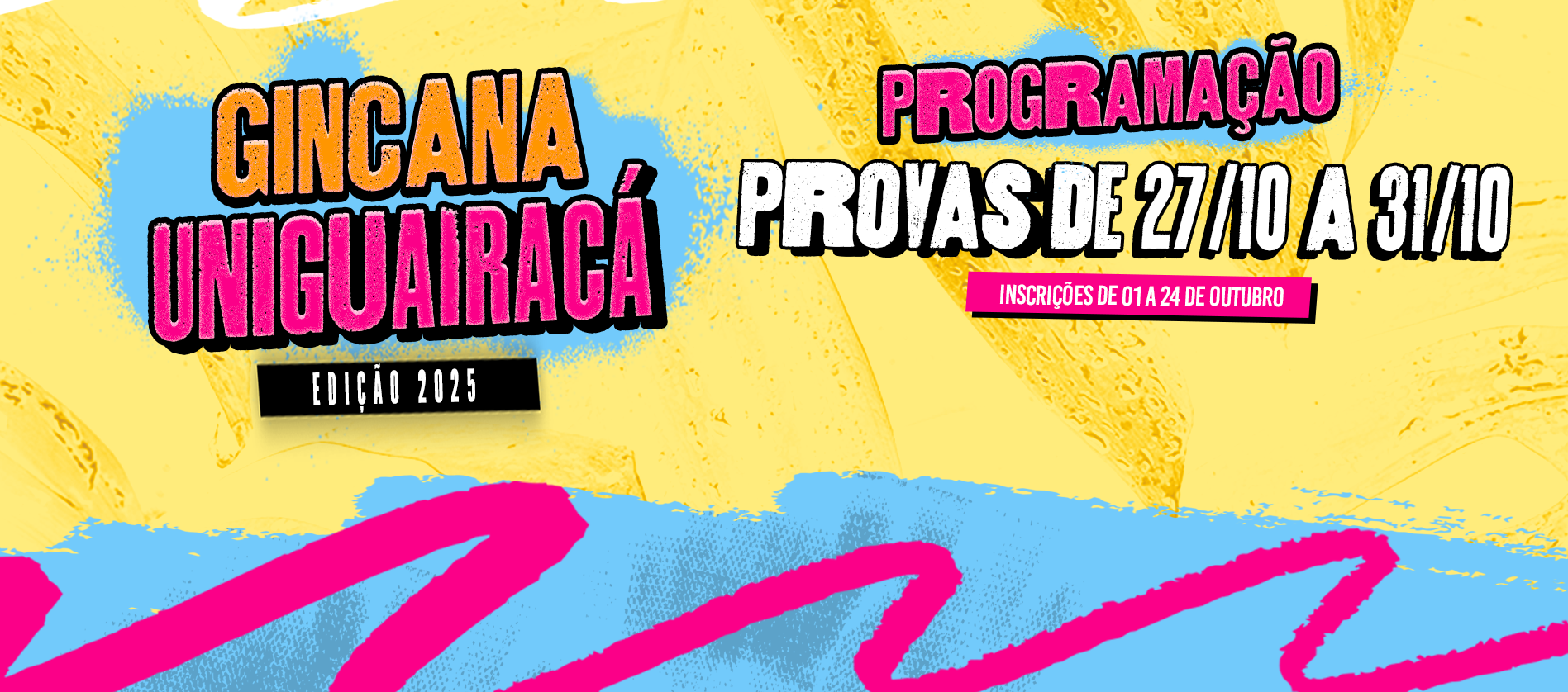 A UniGuairacá Centro Universitário está com inscrições abertas para a Gincana dos 20 anos. O evento é voltado para todos os acadêmicos da instituição e as inscrições seguem até o dia 24 de outubro, através do link.